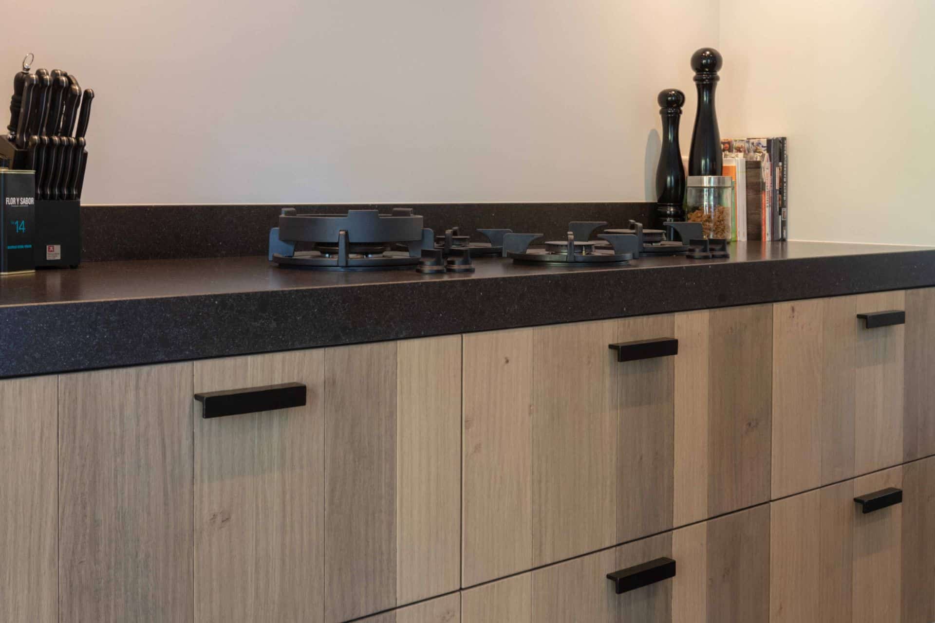 De keuken kenmerkt zich door het eiken fineer front in een wisselende, gebeitste kleur. Het donkere werkblad is van sterk composiet en geeft het geheel een luxe en robuuste uitstraling.