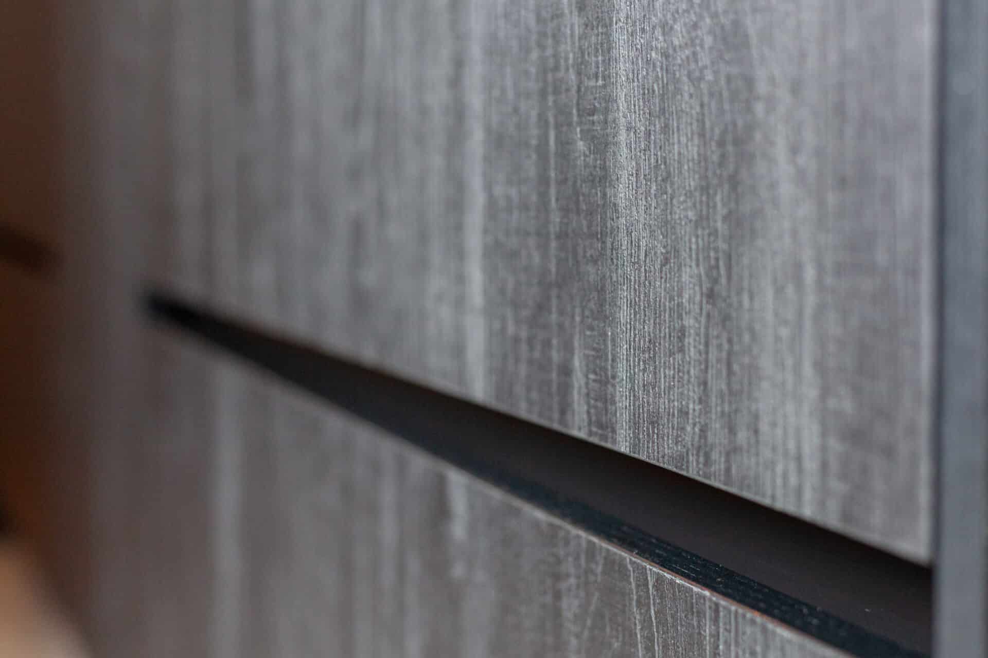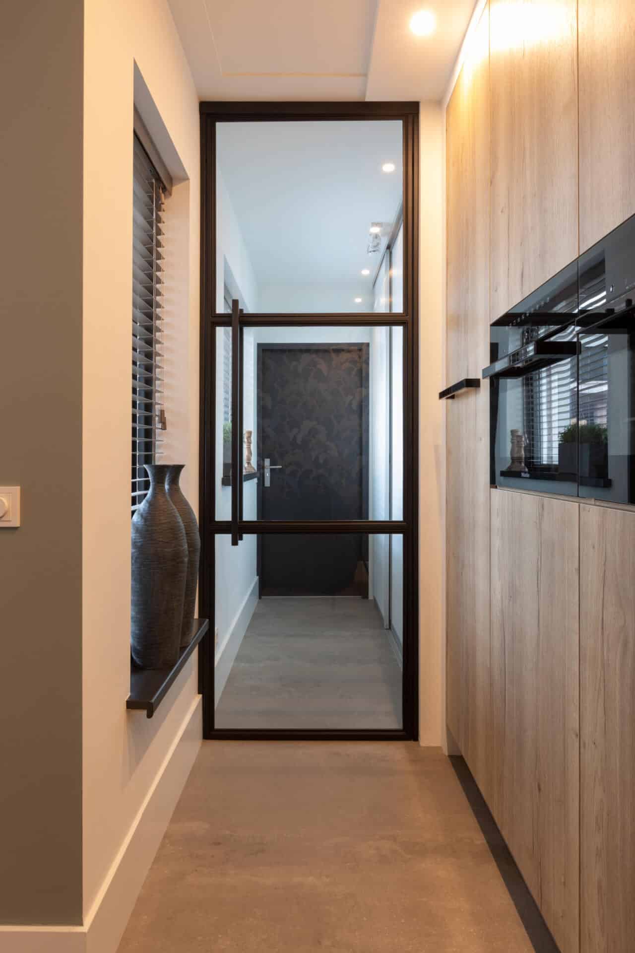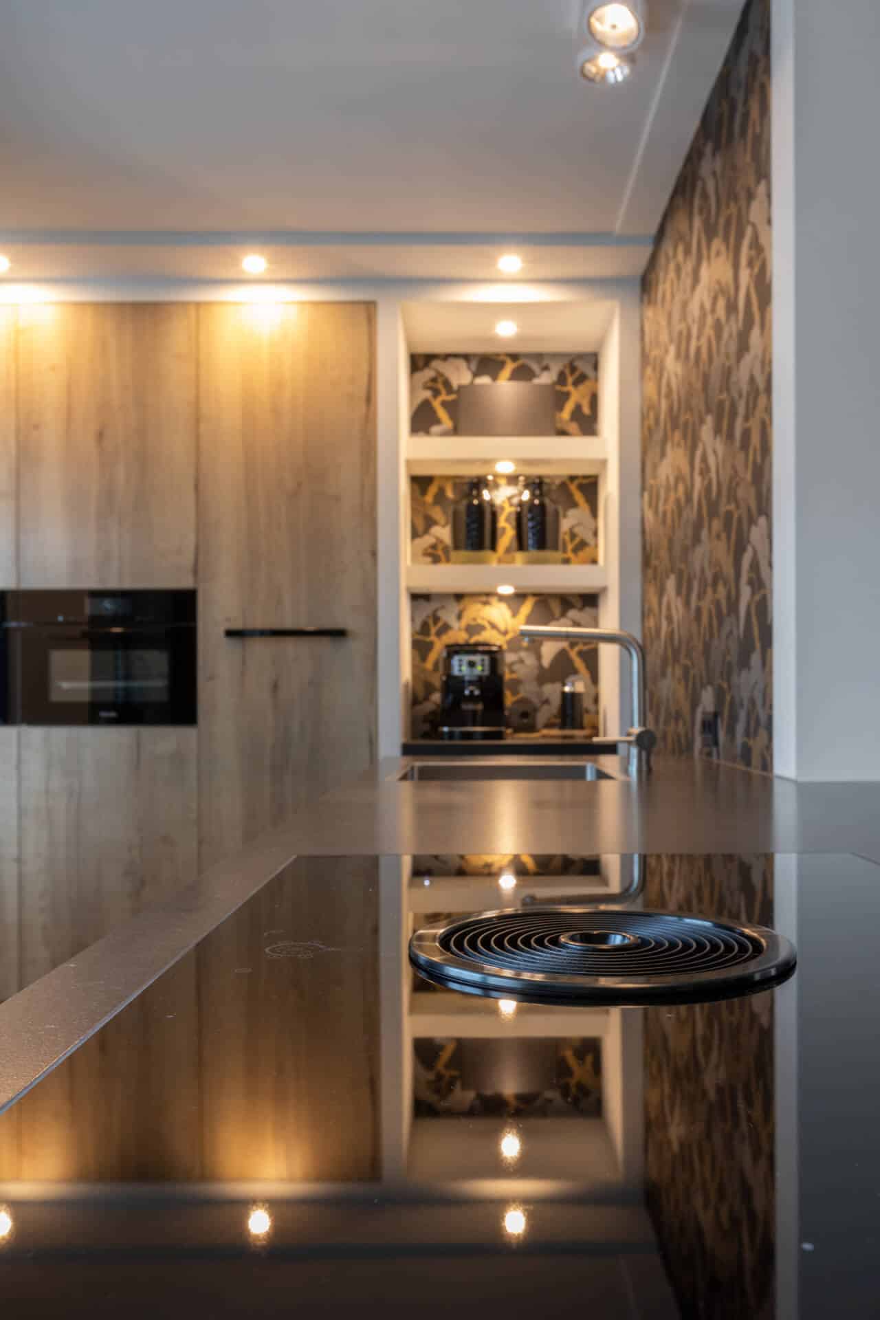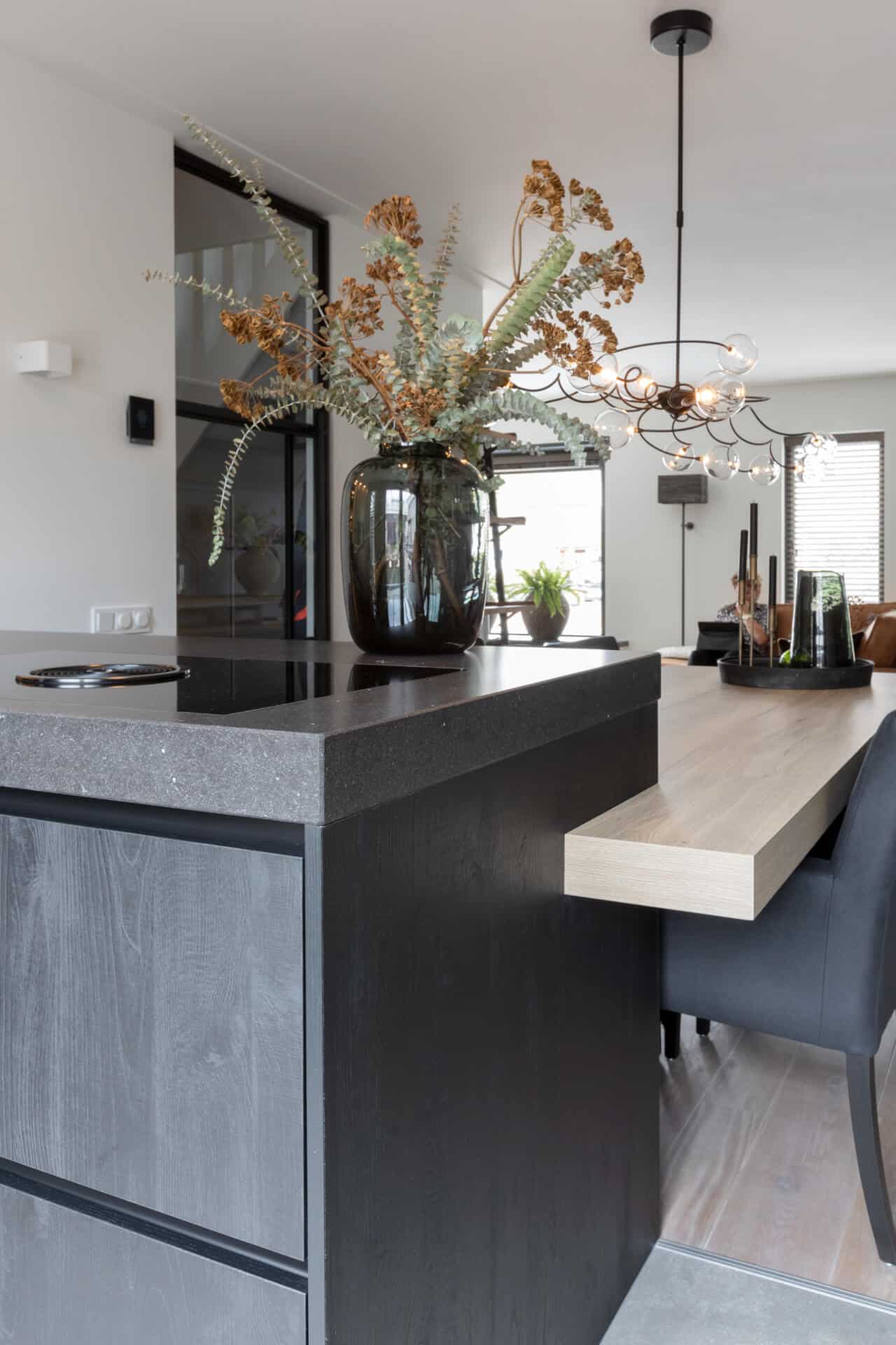 In de keuken is een zwart kookeiland geplaatst. Dit eiland heeft een unieke houtstructuur Ʃn is volledig greeploos. Het kookeiland is gecombineerd met een wild eiken kleurige kastenwand en een werkblad van gezoet composiet. Dat geeft de houten keuken een robuuste uitstraling.