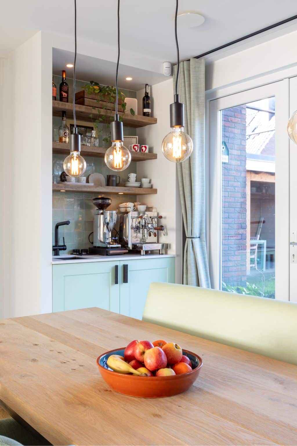 De keuken van deze familie uit Barneveld is een mix tussen verschillende keukenstijlen. Toch zijn diverse landelijke elementen duidelijk herkenbaar, zoals de vorm van de wasbak en de hoge buffetkasten met glas. Moderne elementen zijn ook terug te vinden: zoals het stalen frame voorzien van wagonhouten planken dat boven het keukeneiland is gerealiseerd.