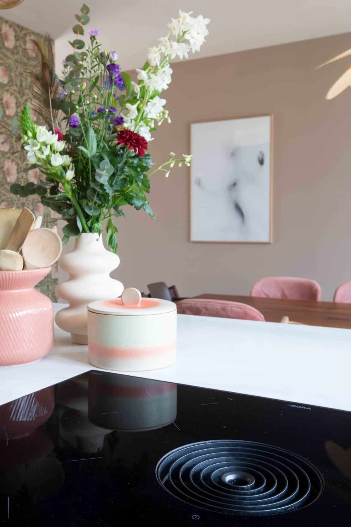 De luxe marmeren keuken is in parallel opstelling geplaatst. Met als middelpunt een ruim opgezet marmeren kookeiland met bar gedeelte. De familie houdt enorm van kokkerellen. Een Bora kookplaat met geïntegreerde afzuiging mocht dan ook zeker niet ontbreken in het stijlvolle kookeiland.