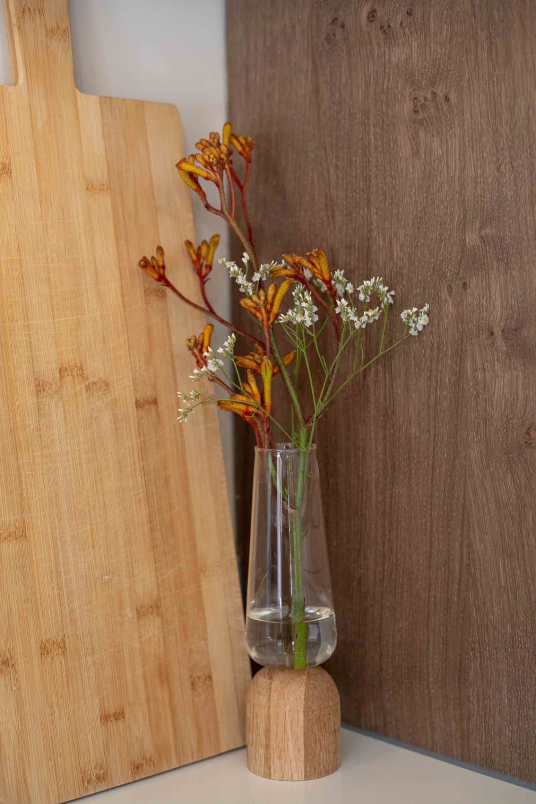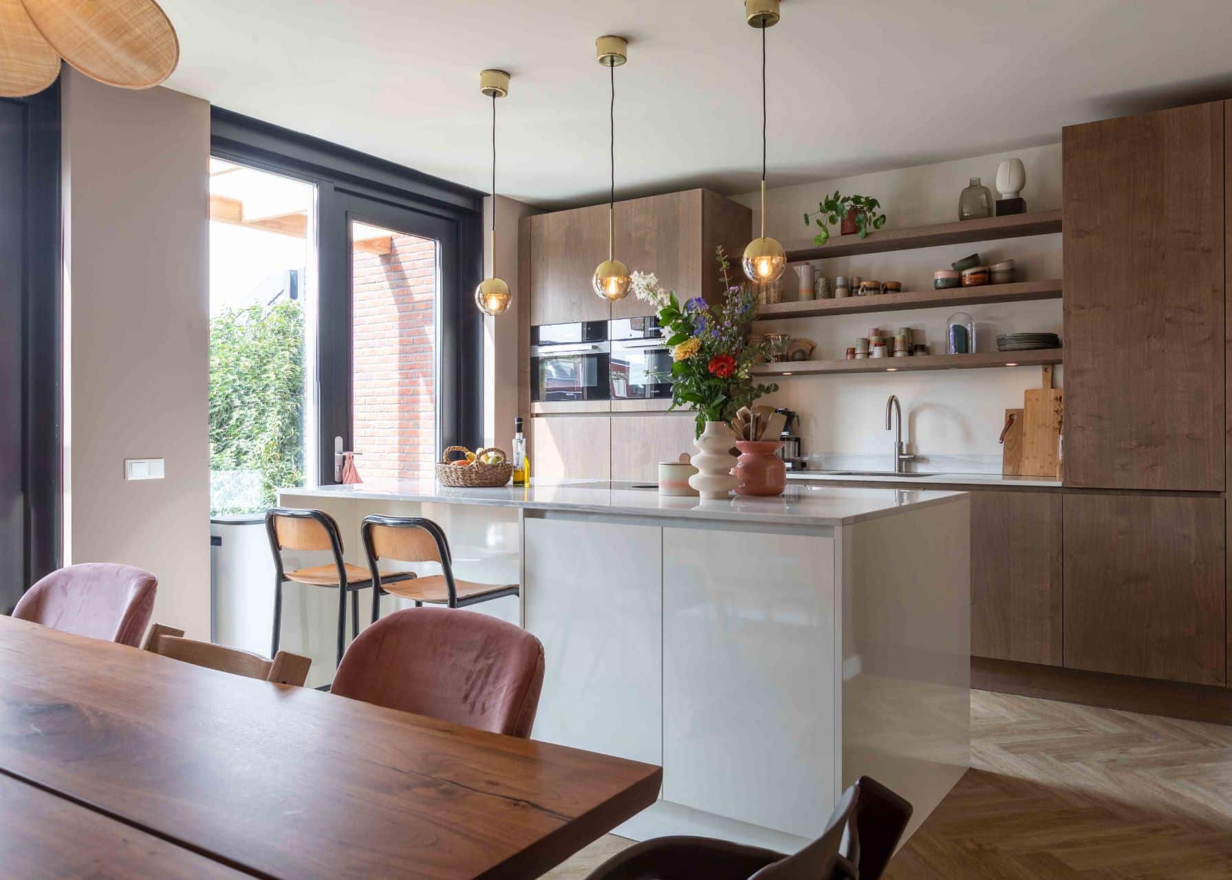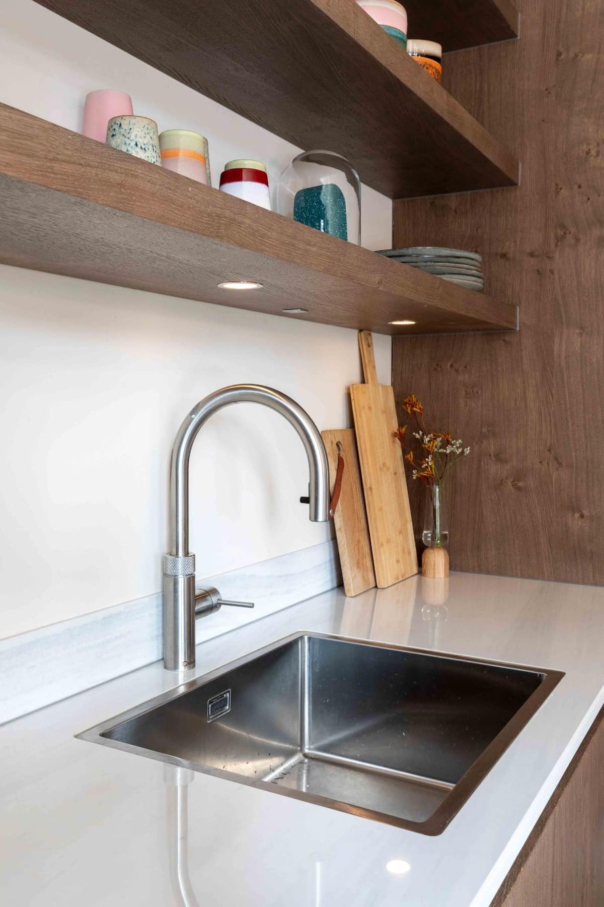 De luxe marmeren keuken is verder ingericht met houten wandkasten, waardoor er extra opbergruimte is gecreëerd. De stoomoven en de heteluchtoven van Miele zijn prachtig verwerkt in de houten wandkasten. Ten slotte mocht een kokendwaterkraan van Quooker niet ontbreken in de luxe keuken.