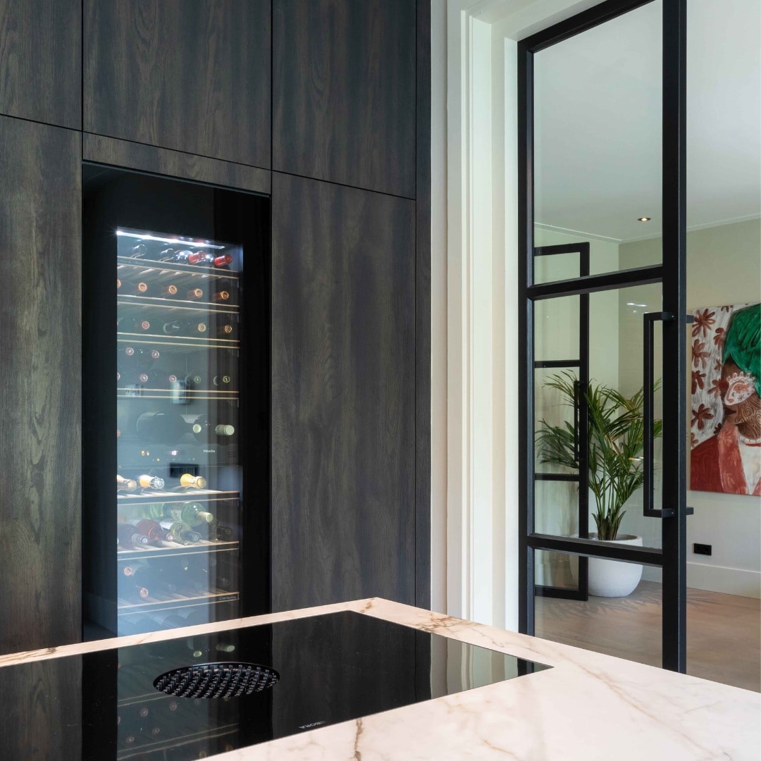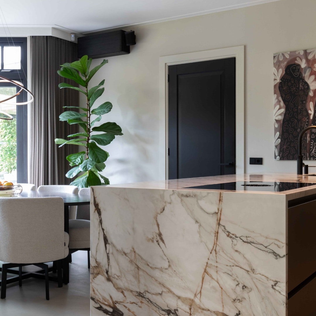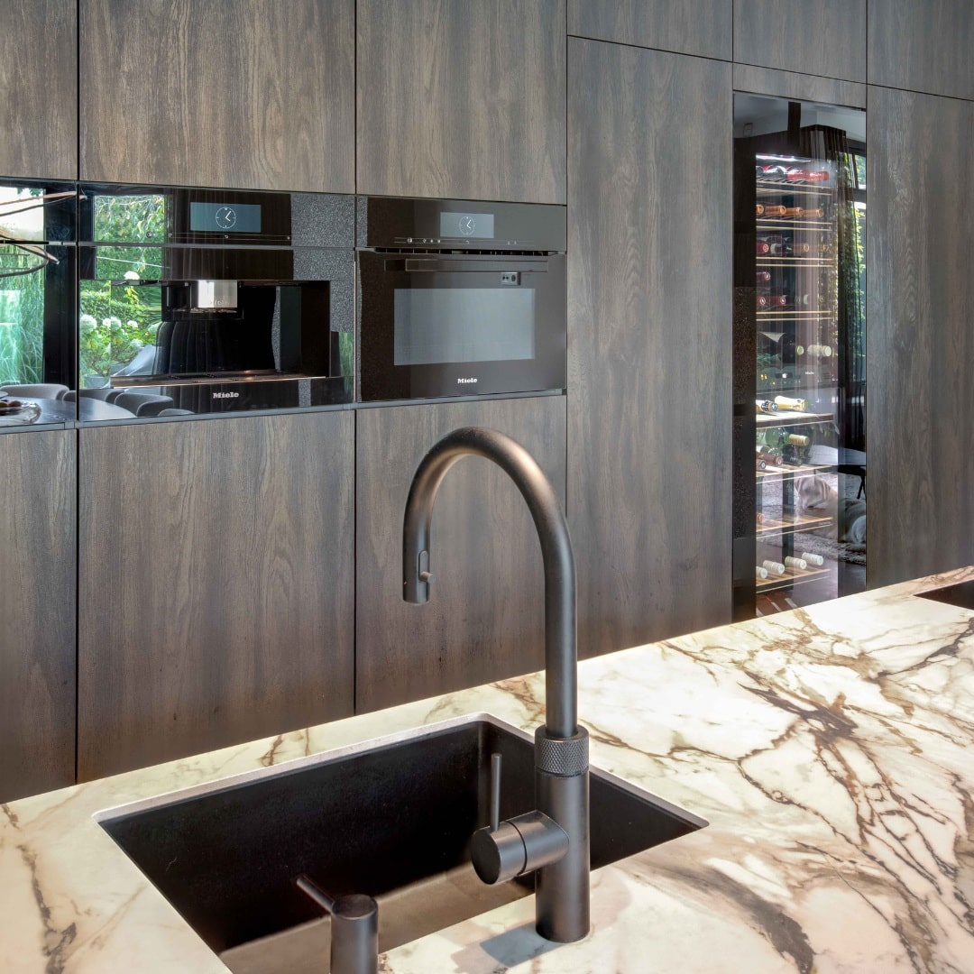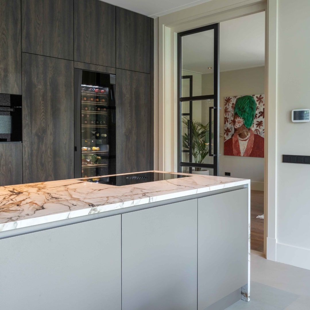 De donkere houten keuken kasten geven de keuken diepte en warmte. De matte fenix keukenfronten en het glanzende marmeren kookeiland zorgen daarentegen voor een stijlvol contrast.