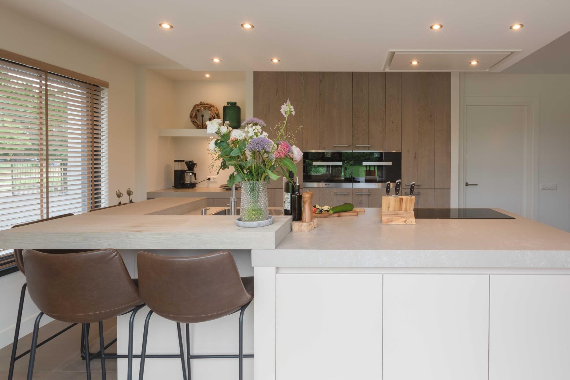 Een gezellige leefkeuken, dat is het geworden. De keuken is uitgevoerd in geborsteld fineer eiken met een V-groef. Dit is gecombineerd met mat gespoten MDF in de kleur kashmir. De greeploze afwerking draagt bij aan de robuuste en pure uitstraling van de keuken.