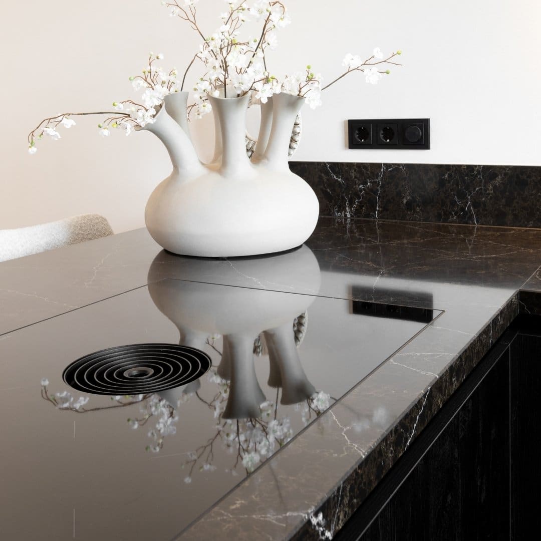 - Kleurgebruik: Zwart hout, zwart-beige marmerlook en subtiele lichte accenten.