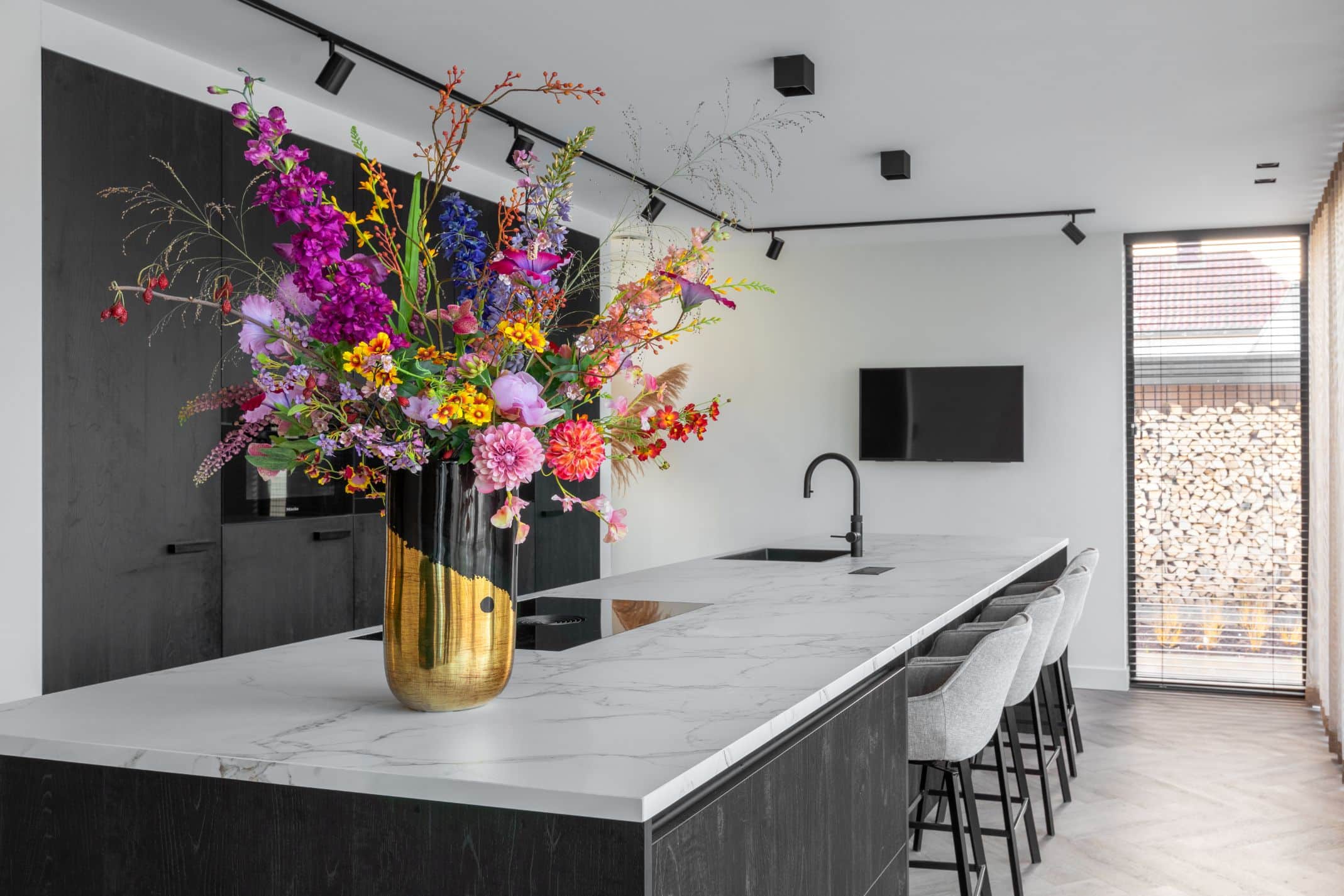 Groot, groter, grootst! Deze moderne keuken heeft een groot kookeiland van maar liefst 5,10m². Hierdoor is er genoeg ruimte om de meest complexe maaltijden te maken én is er genoeg ruimte om ook lekker te tafelen. Het kookeiland is voorzien van een gemarmerd dekton blad, een echte eyecatcher. De Quooker Flex en de Quooker Cube geven het kookeiland niet alleen de mogelijkheid om direct kokend water, maar ook bruisend water te schenken.