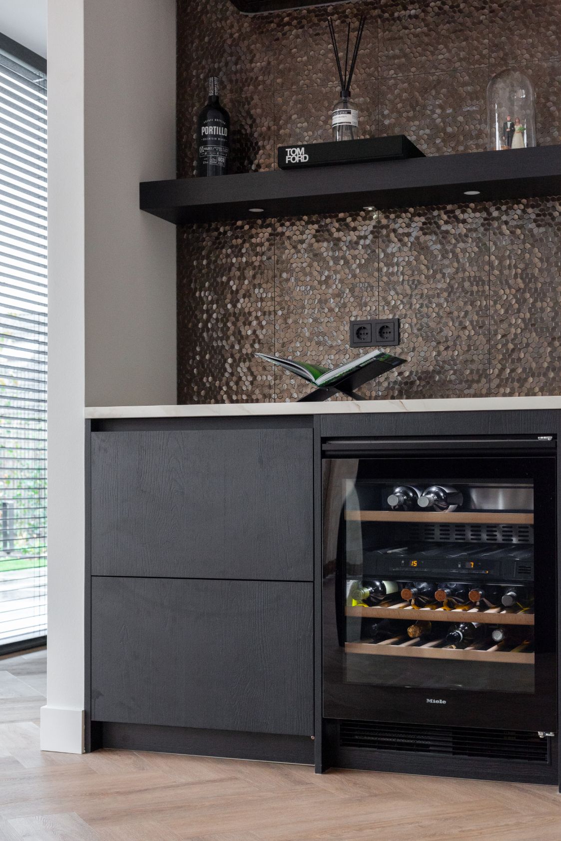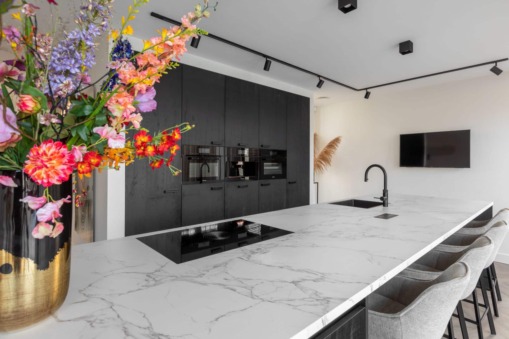 De keuken is voorzien van zwarte fronten met houtstructuur, wat het geheel een warme uitstraling geeft. De Miele apparaten uit de 7000 serie zorgen voor optimaal kookgenot en zijn mooi verwerkt in kastenwand. Naast de gebruikelijke oven en combimagnetron is er ook een klimaatkast voor wijn geplaatst, zodat uw mooiste wijnen altijd op hun best zijn.