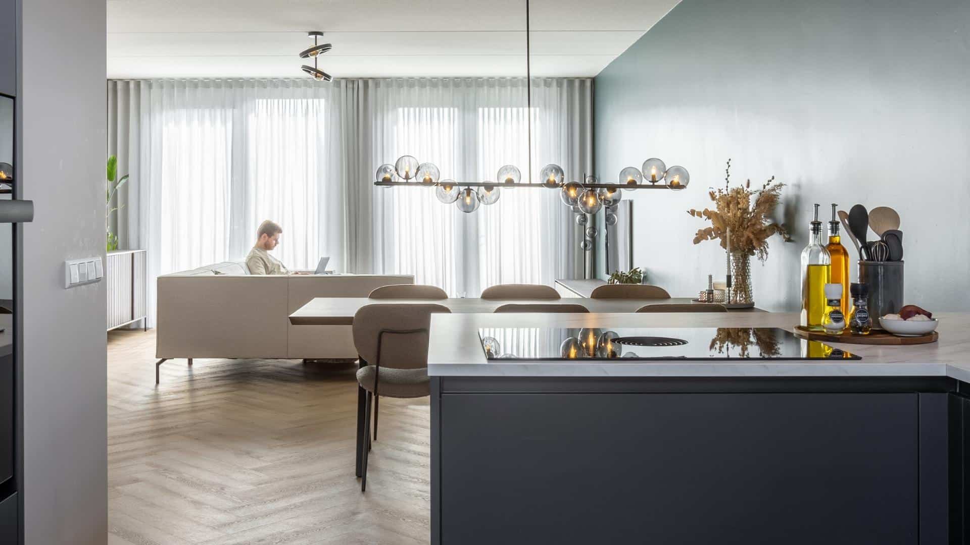 - Materialen: Natuursteenlook werkblad, houtlook vloer en strakke keukenkasten.