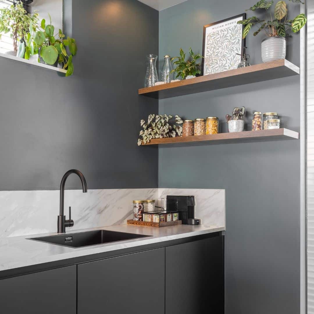 - Kleur: Zwarte kasten en lades, groene wanden en een houtlook vloer.