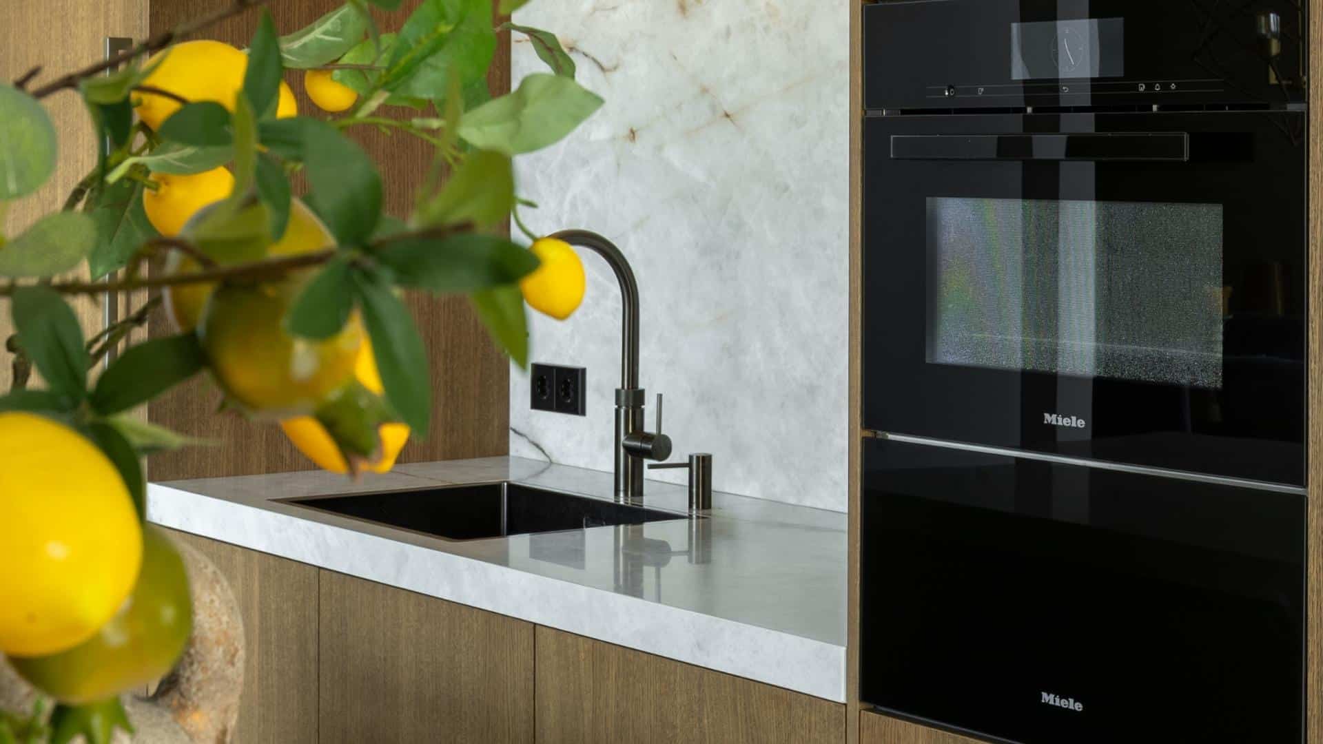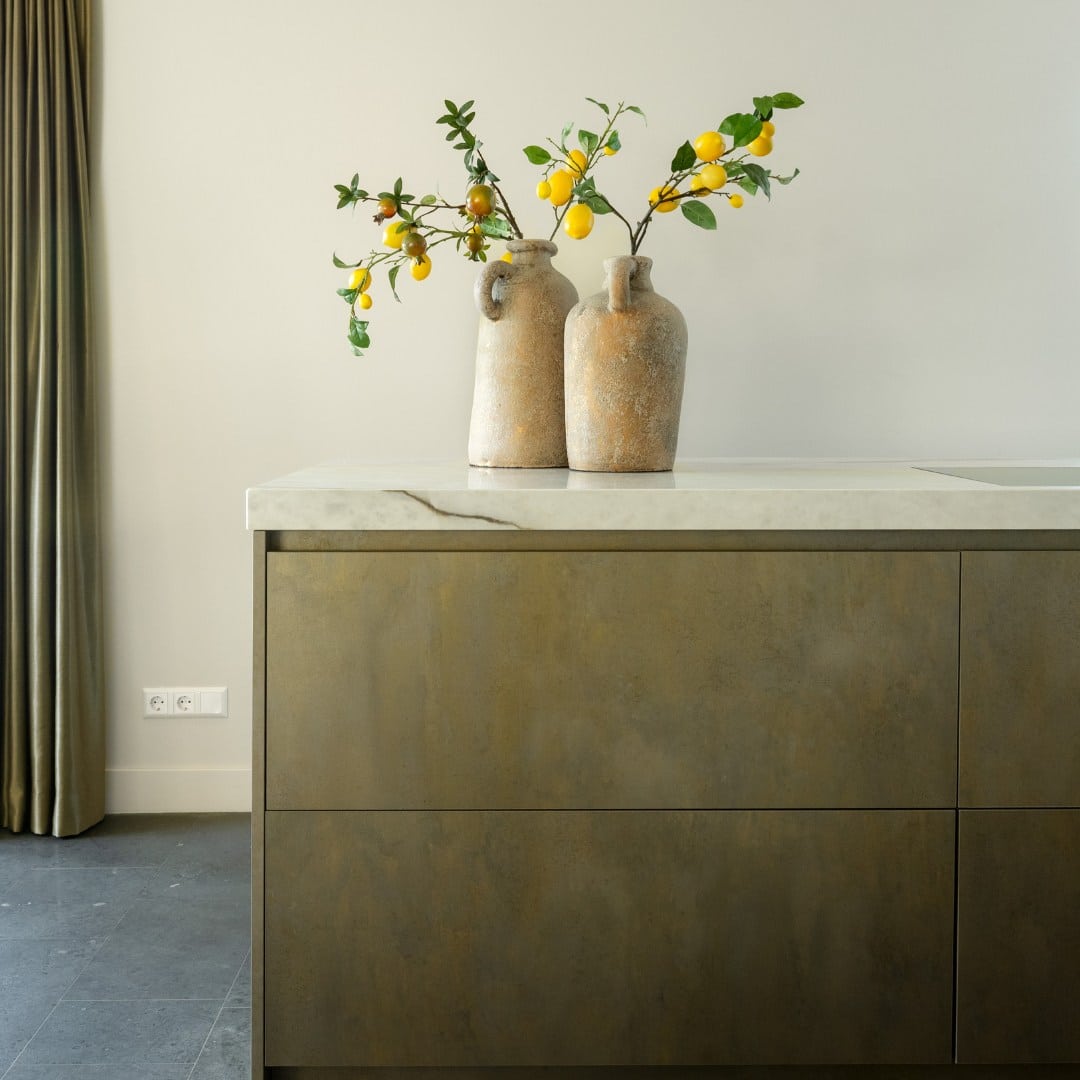 Het ruime kookeiland biedt volop plek om te koken en samen te zijn. Het marmerlook blad versterkt het gevoel van luxe, terwijl de zijkanten en lades zijn afgewerkt in verweerd grijs-groen. Alles straalt rust uit, waardoor u zich volledig kunt richten op het bereiden van maaltijden. Op het eiland staan aardewerken vazen met citroenplanten, die een mediterrane sfeer brengen. Dit detail zorgt voor een vrolijke en persoonlijke touch, waardoor het eiland het hart van de keuken vormt.