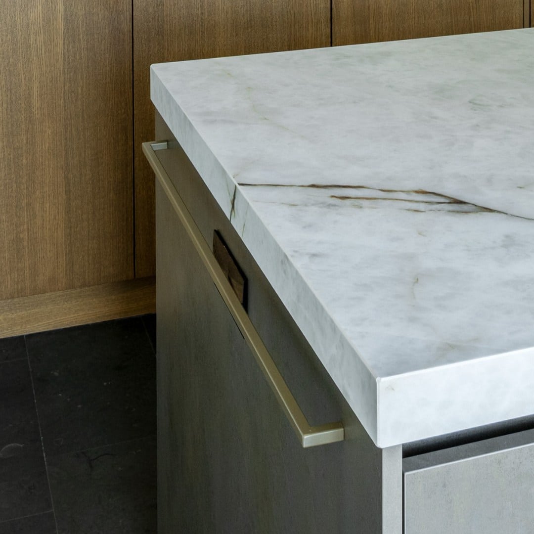 In deze moderne keuken in Hoevelaken vormen warme aardetinten het uitgangspunt. De donkere vloer zorgt voor een solide basis, terwijl het kookeiland meteen in het oog springt. Dit eiland heeft een blad met marmerpatroon en onderkasten in verweerd groengrijs. De mix van tinten en materialen geeft de ruimte een kalme en uitnodigende uitstraling. Hier draait alles om het koken, waarbij stijl en gebruiksgemak hand in hand gaan.