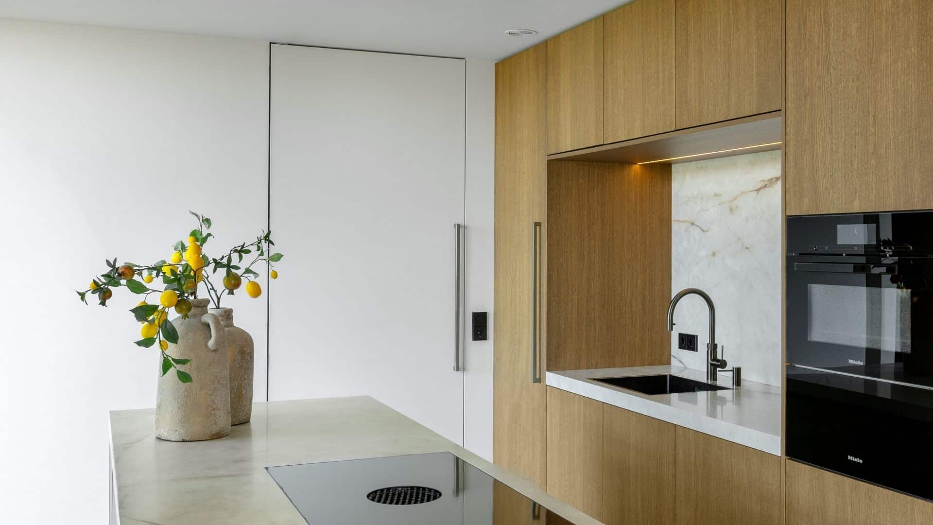 De keuken is uitgerust met een kastenwand van licht eikenhout. De zichtbare houtnerf voegt warmte toe en geeft de keuken een tijdloos gevoel. In de kastenwand zit een verlichte nis, waarin het keukenblad en de achterwand mooi afsteken tegen het hout. De Quooker in een donkere tint springt direct in het oog en vormt een fraai detail. Samen met het lichte hout levert dit een gebalanceerd geheel op.