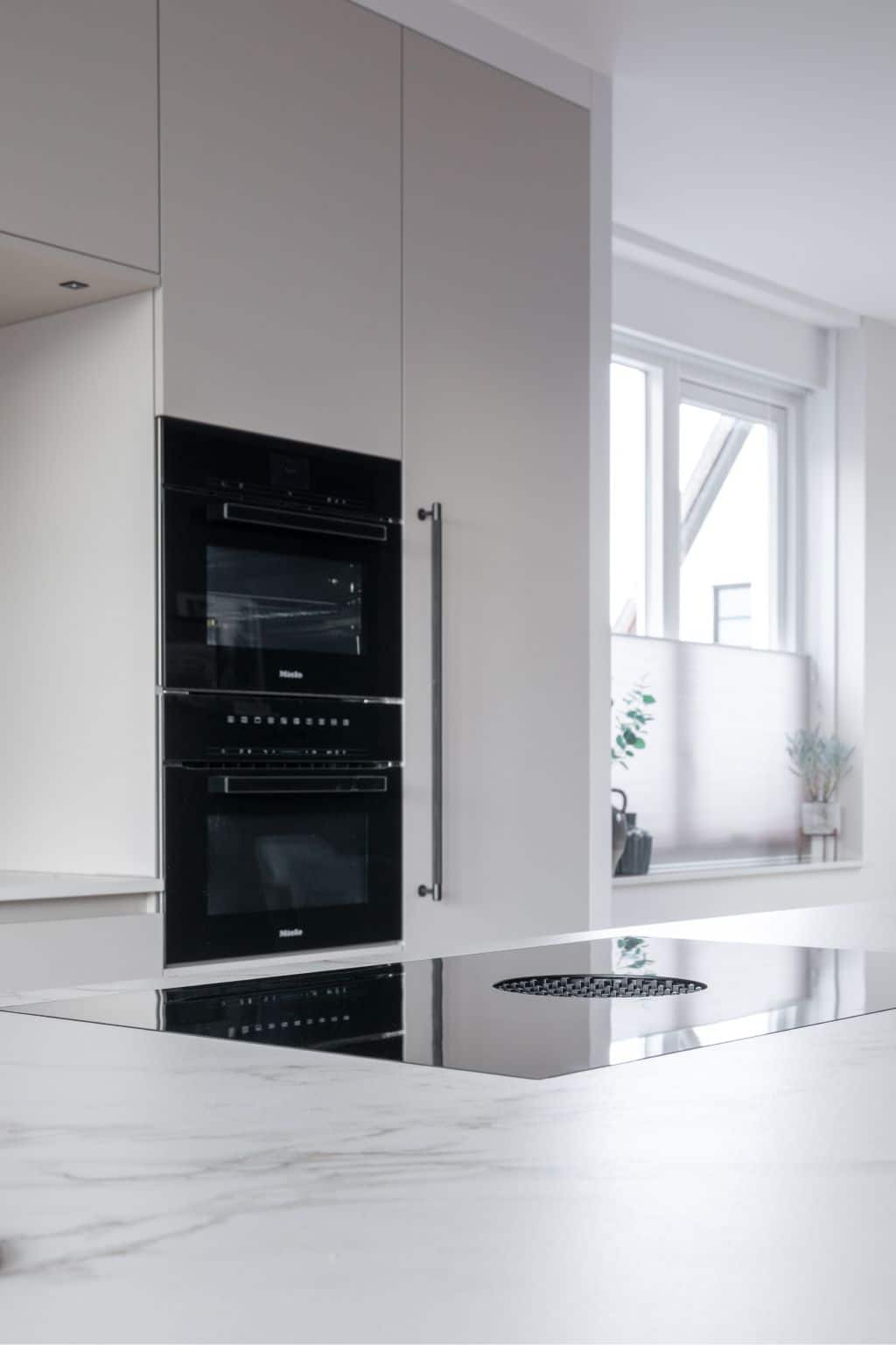 Het marmerlook dekton-werkblad is van hoge kwaliteit. Het blad draagt bij aan de luxe uitstraling van deze ruime woonkeuken. De kleur sluit perfect aan op die van het keukeneiland.