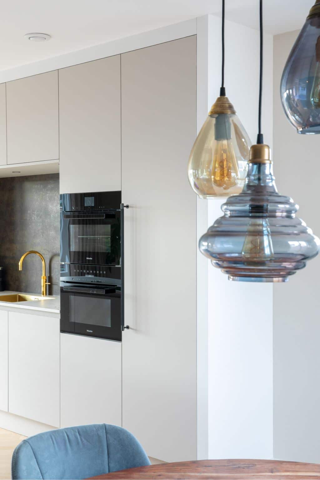 De spoelnis in de kastenwand is een opvallend en praktisch detail. De rugwand is gemaakt van keramiek en uitgevoerd in de kleuren brons en koper. De gouden Quooker-kraan in combinatie met de gouden spoelbak zorgen voor een chique geheel. De hoge koelkast is voorzien van stoere grepen. Ze zijn gemaakt door het exclusieve merk Buster en Punch.