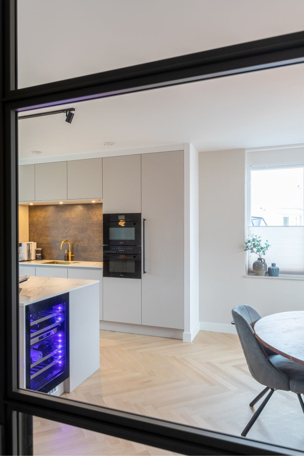 Elk detail in deze moderne lichte keuken is afgestemd op het totaalplaatje. De combinatie van lichte kleuren en materiaalgebruik maakt deze keuken uniek. De lichte kleur van de kasten sluit aan op die van het ruime kookeiland. De wijnkast aan de kopse kant van dit eiland is een prachtige blikvanger.