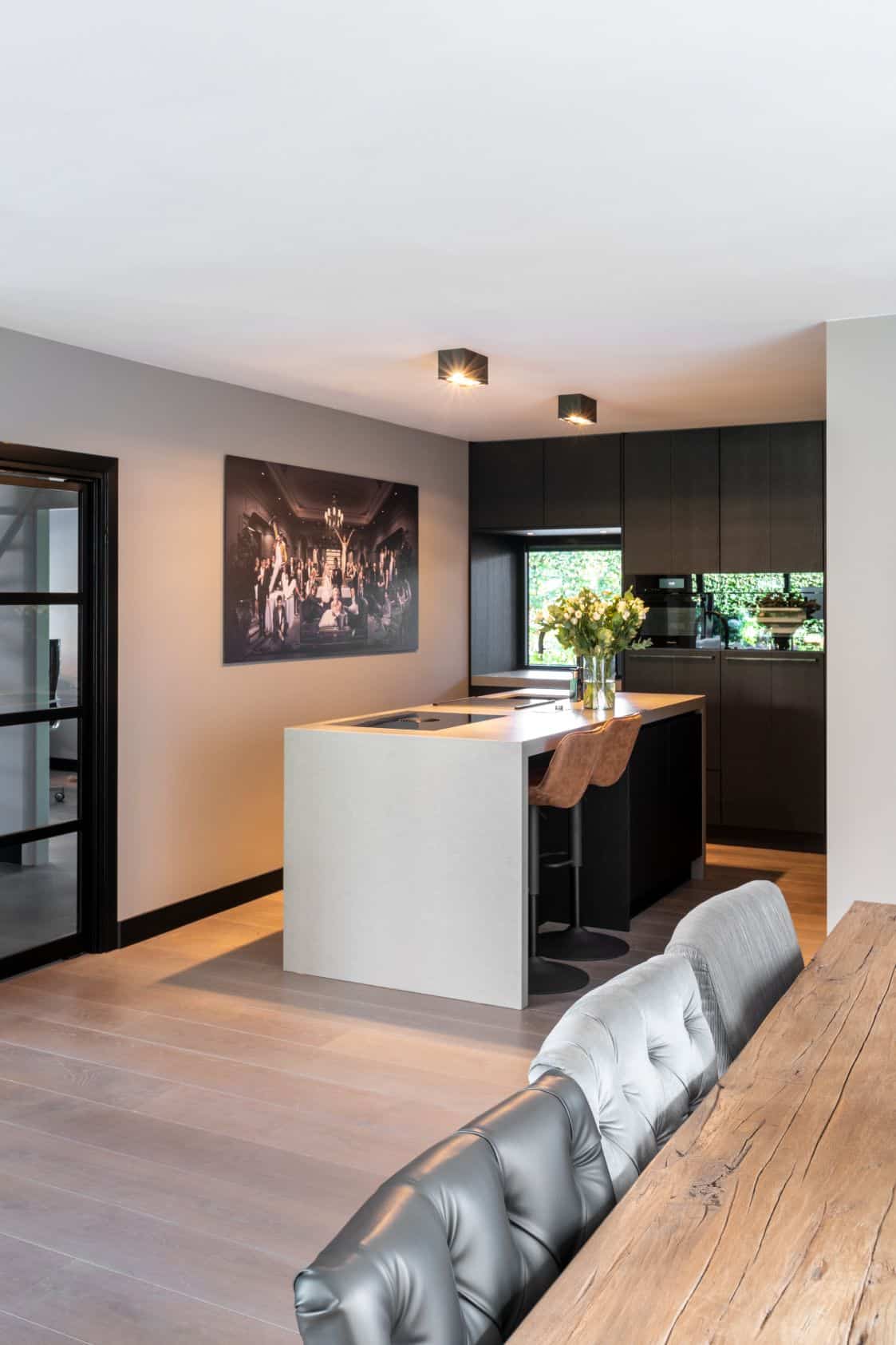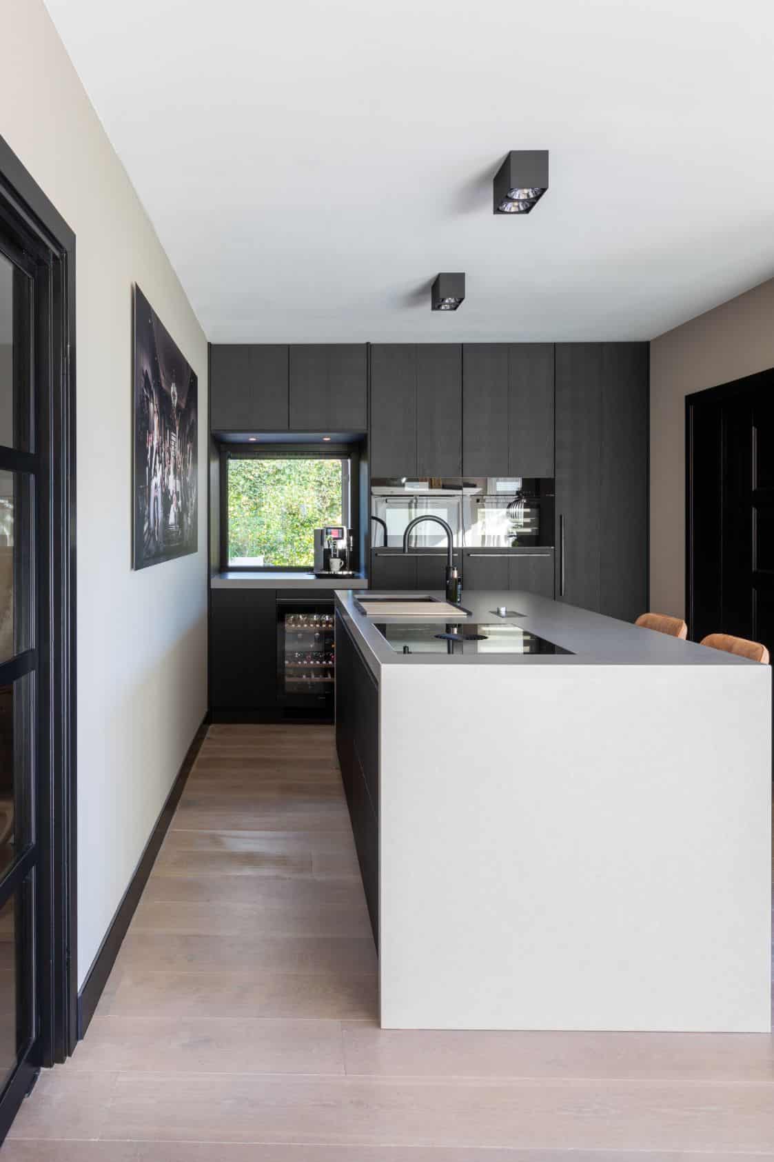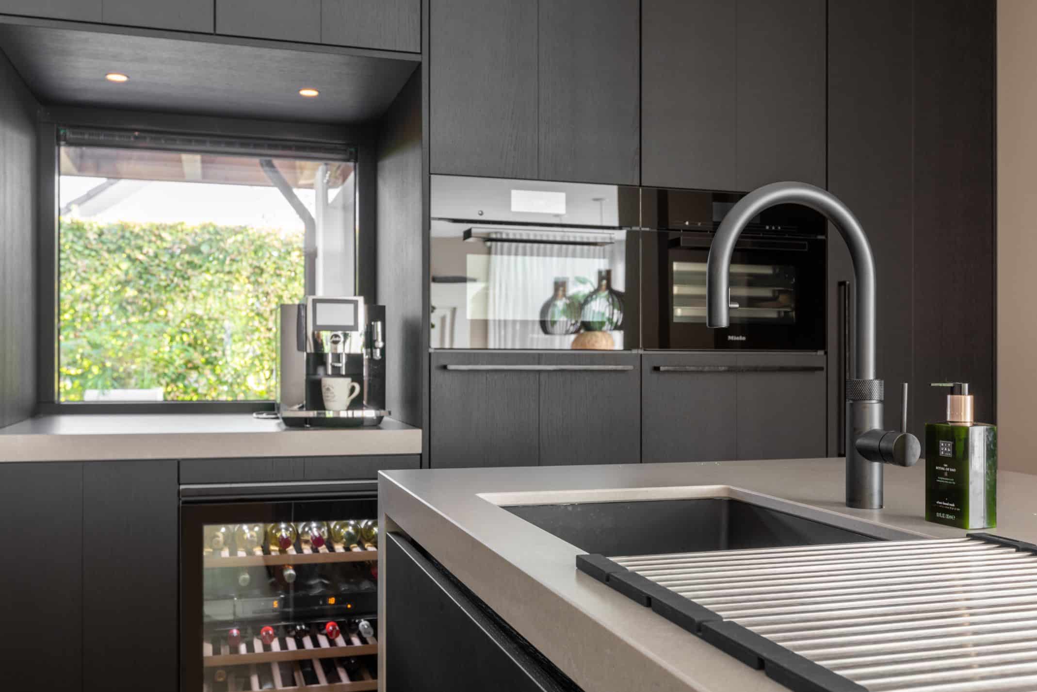 De kastenwand is volledig op maat gemaakt en afgewerkt met eiken fineer frontjes. Deze zijn zwart gespoten en geven daardoor diepte aan de keuken. De Miele apparaten passen met hun obsidiaanzwarte kleur daar perfect bij. Een mooi detail is dat de vaatwasser op hoogte is ingebouwd en daardoor strak in de keuken past.