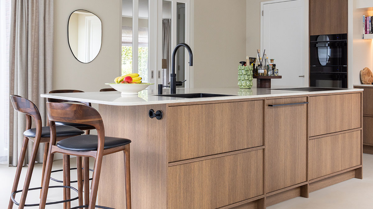De warme notentint sluit naadloos aan bij de Japandi woonstijl, waarin eenvoud en balans centraal staan. Strakke lijnen krijgen hier bewust tegenwicht door zachte vormen. Het kookeiland heeft afgeronde hoeken en voelt daardoor vriendelijk en toegankelijk aan. Deze vorm verzacht de kastenwand en maakt het geheel minder formeel. De subtiele kadering van de fronten houdt het beeld rustig en overzichtelijk.