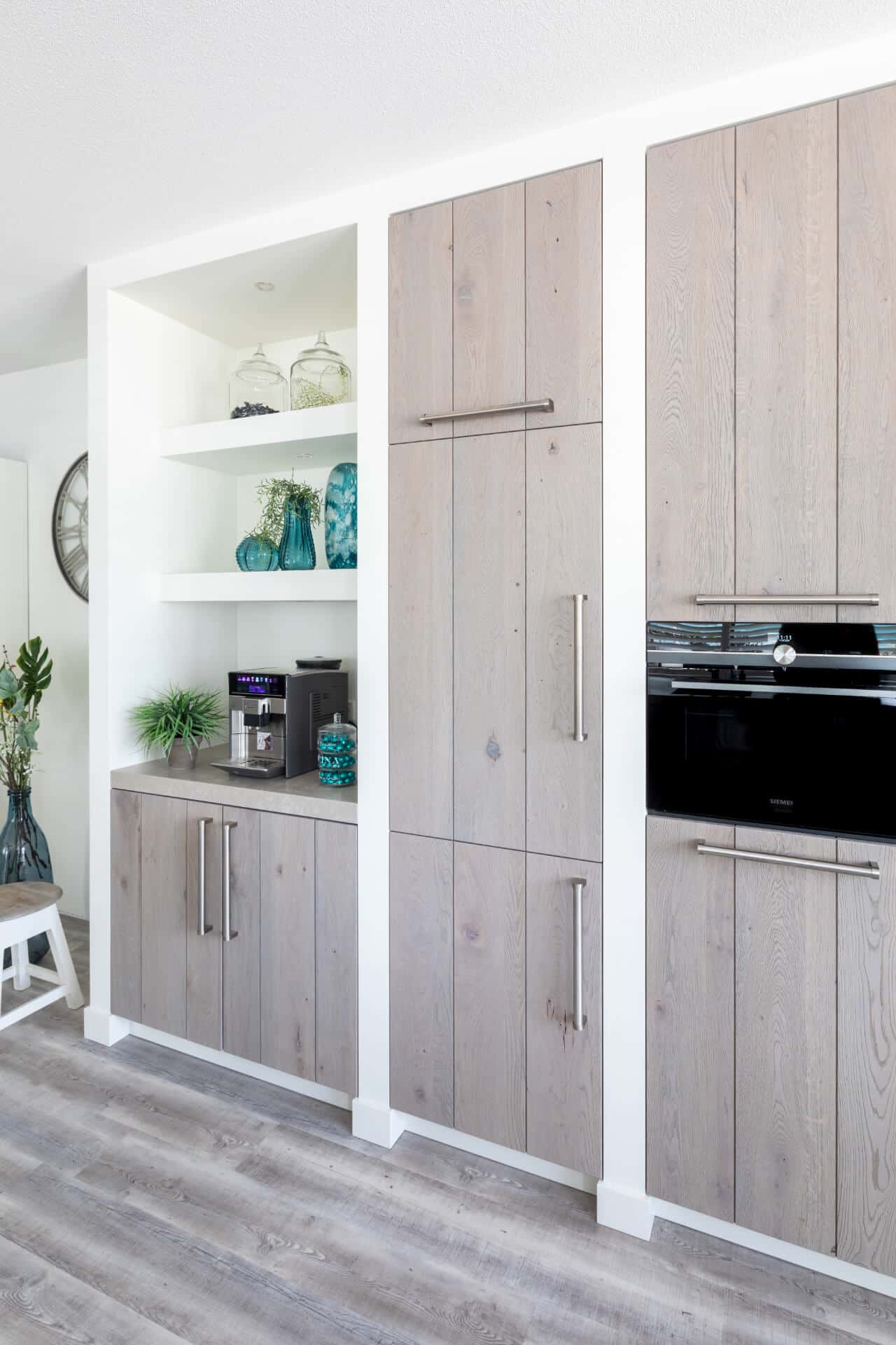 De planken van deze massief houten keuken zijn 20 centimeter breed. Wat deze woning zo speciaal maakt, is dat de keuken doorloopt in het woongedeelte als eethoek. Dat zorgt voor een open sfeer en warm gevoel in de gehele woning. Voor deze keuken is gekozen voor Studioline apparatuur van Siemens, in de kleur gun metal.