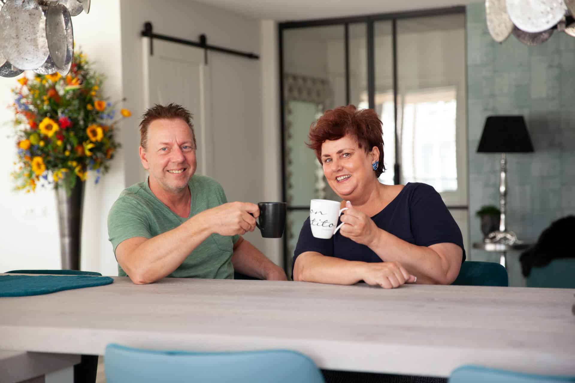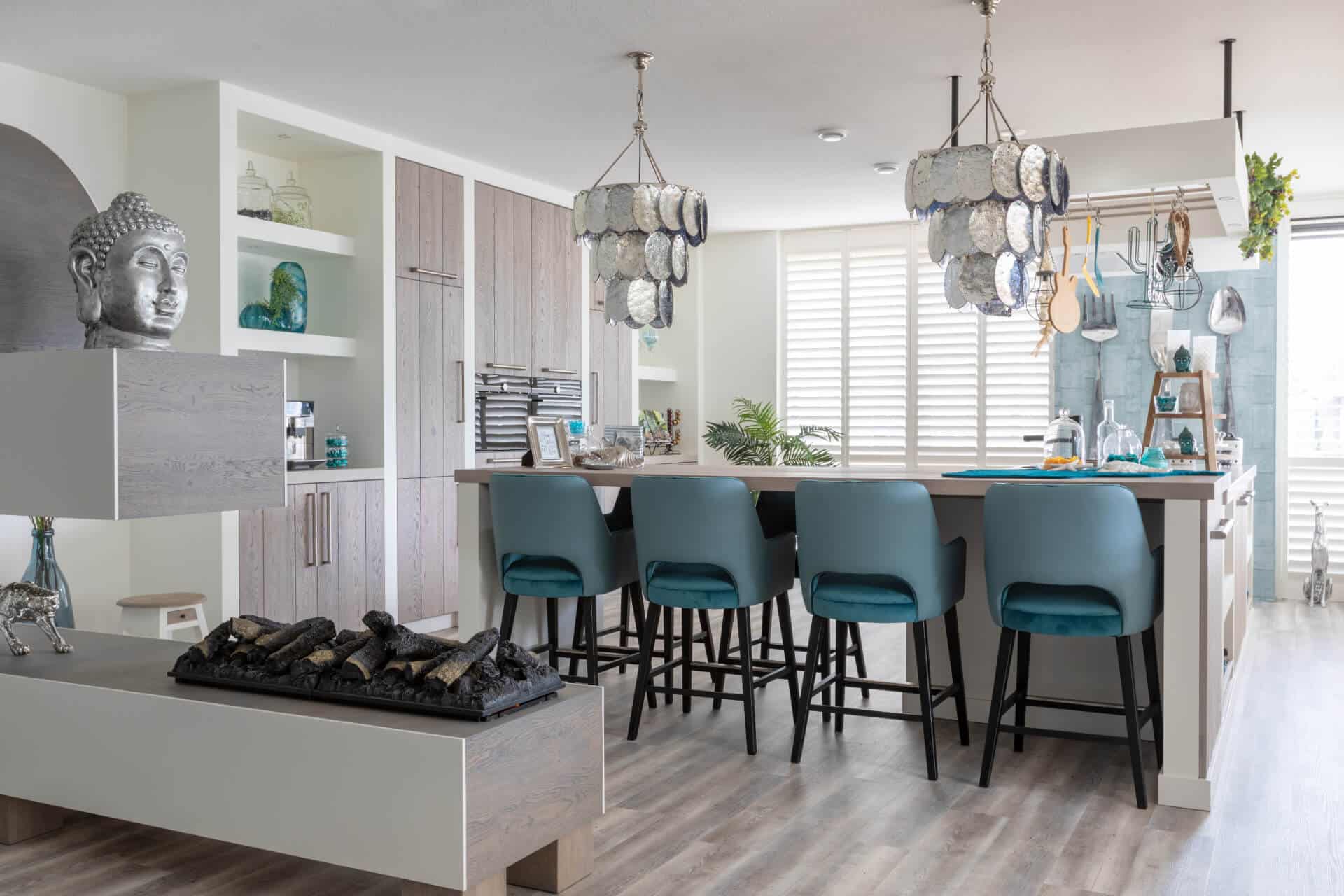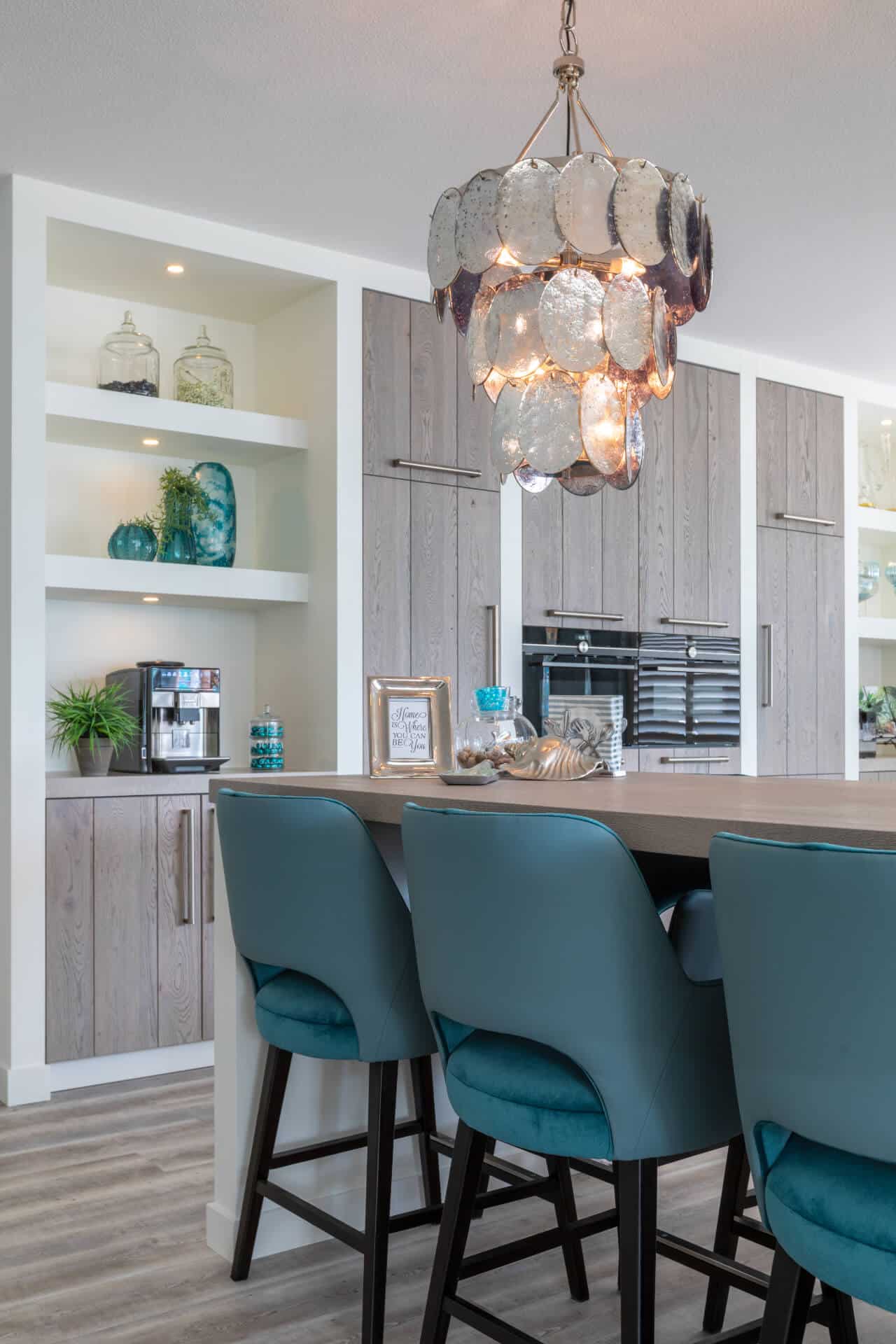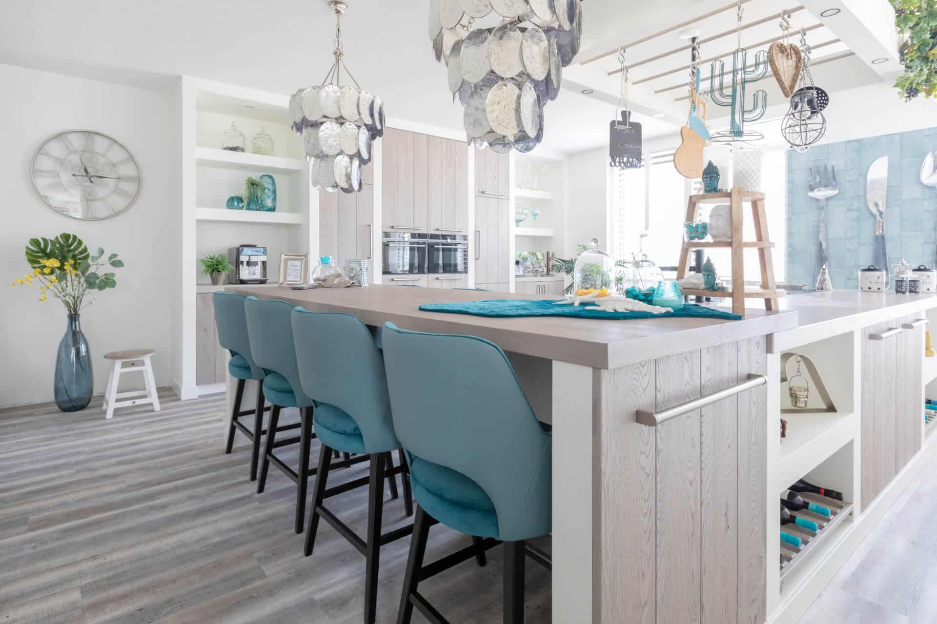 In samenwerking met Eigenstijl Wonen uit Barneveld is het complete interieur tot stand gekomen. Zo zijn de petrolkleurige barkrukken en de PTMD schelplampen afkomstig van Eigenstijl Wonen.