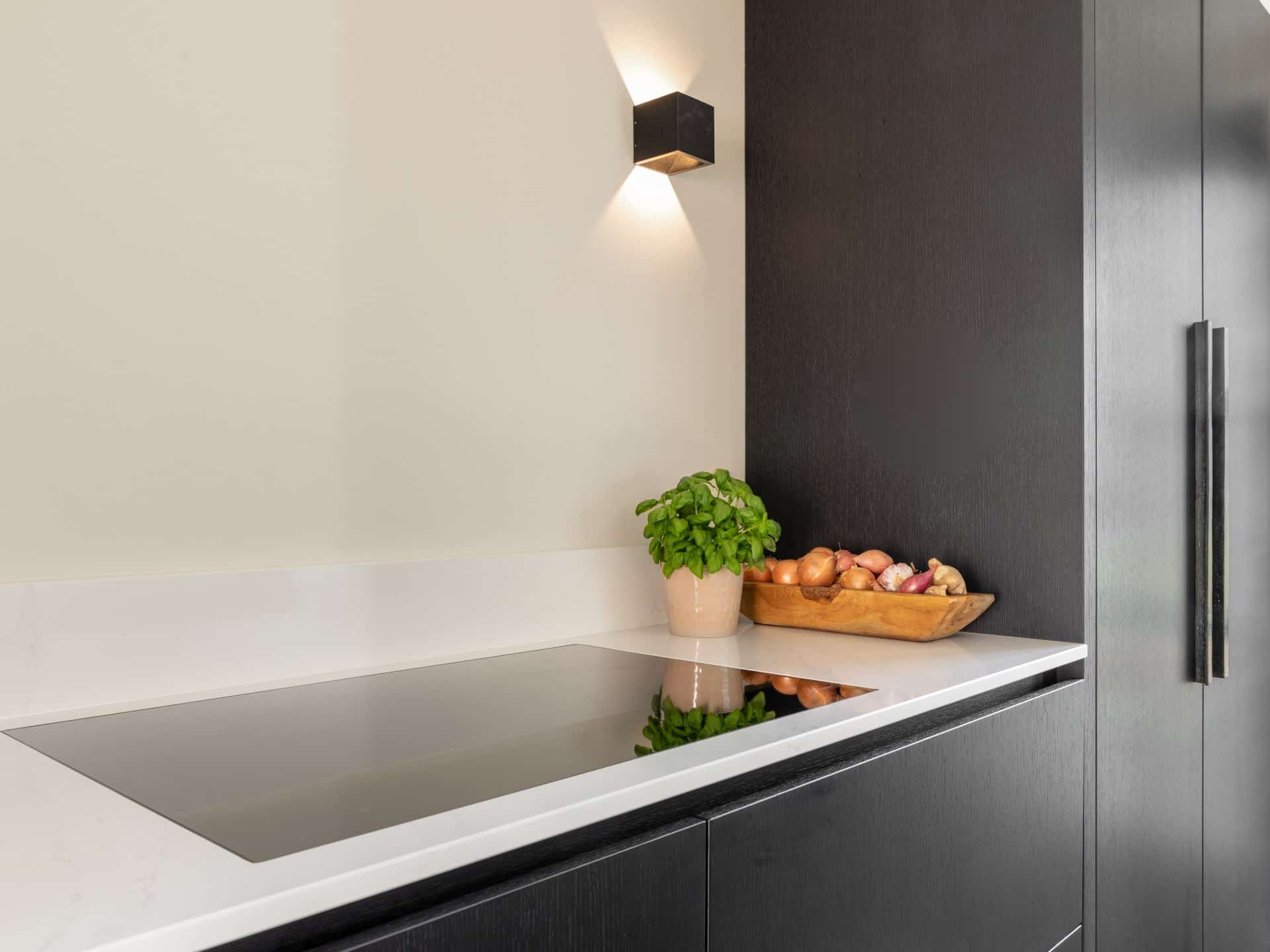 In Woudenberg heeft Van Ginkel Keukens een greeploze zwarte keuken geplaatst met een werkblad in de kleur hoogglans wit. In de keuken zijn prachtige hoge wandkasten verwerkt waar opbergruimte is gecreëerd. Van Ginkel Keukens heeft de hoogwaardige keukenapparatuur van Miele geïntegreerd in de wandkasten.