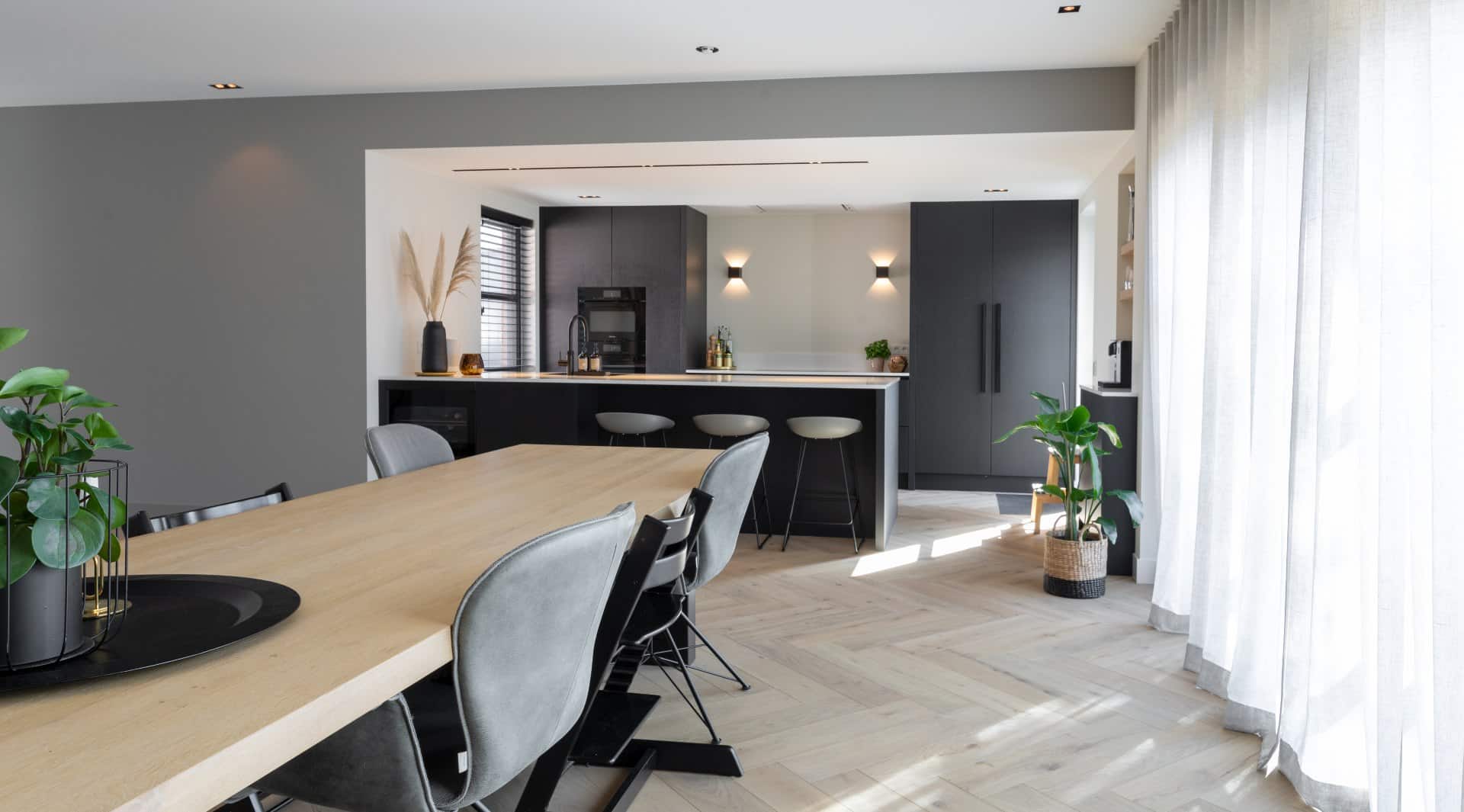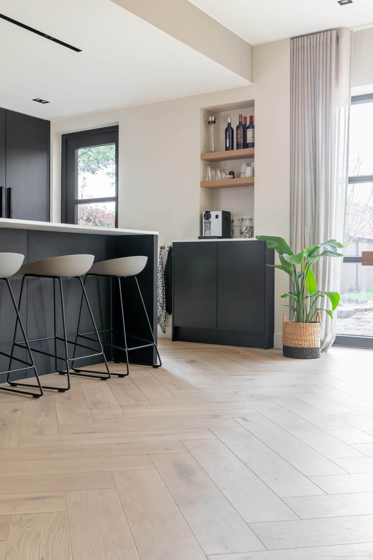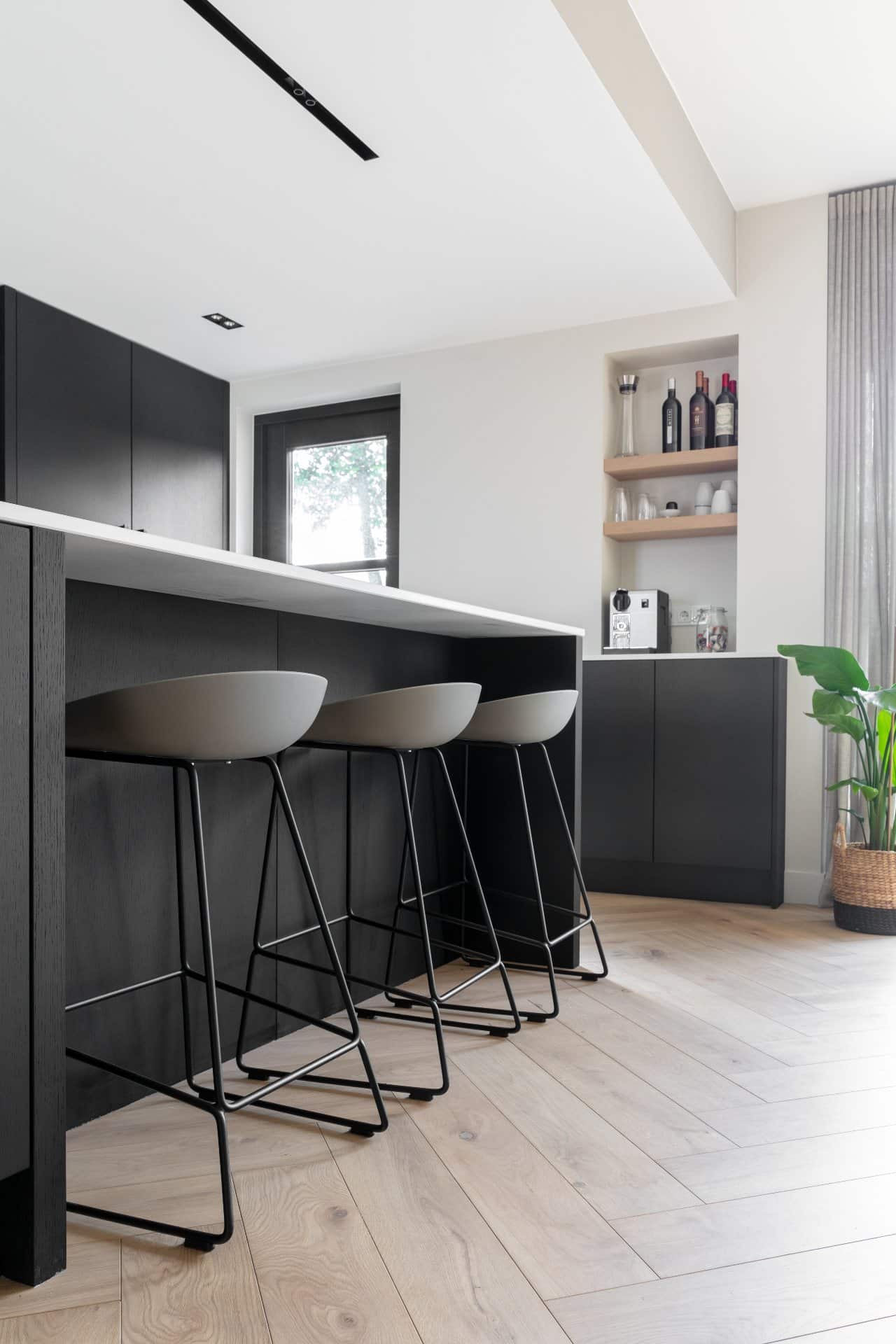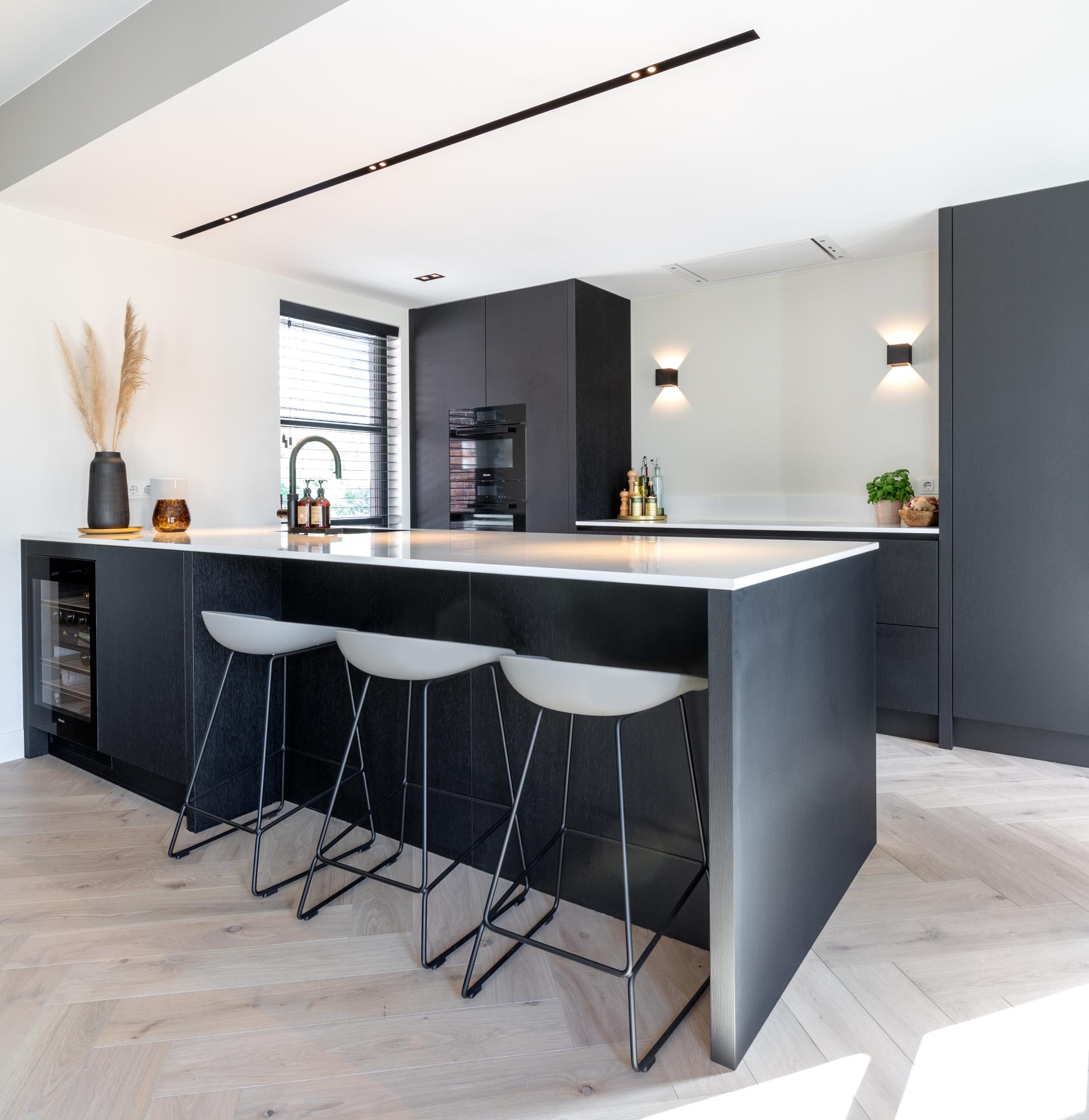 De stijlvolle moderne zwarte keuken is riant opgezet in een schiereilandopstelling. Het schiereiland vormt de verbindende factor tussen de keuken en de woonkamer. Om een heerlijke plek te creëren waar de familie met vrienden en familie tot in de late uurtjes kan borrelen is de keuken daarnaast voorzien van een sfeervol bargedeelte.