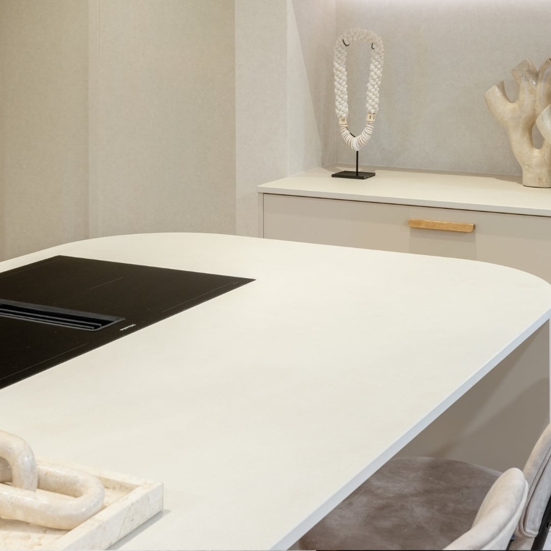 Deze ronde keuken in onze showroom in Barneveld laat zien hoe een doordacht ontwerp bijdraagt aan de sfeer. Ronde vormen geven een zachte, open uitstraling. Geen scherpe hoeken, maar vloeiende lijnen die de ruimte vriendelijkheid geven. De combinatie van lichte kleuren en warme materialen maakt de keuken toegankelijk. Dit ontwerp past in verschillende woonstijlen en zorgt voor een fijne plek in huis. Een plek om samen te koken, te praten en te genieten.