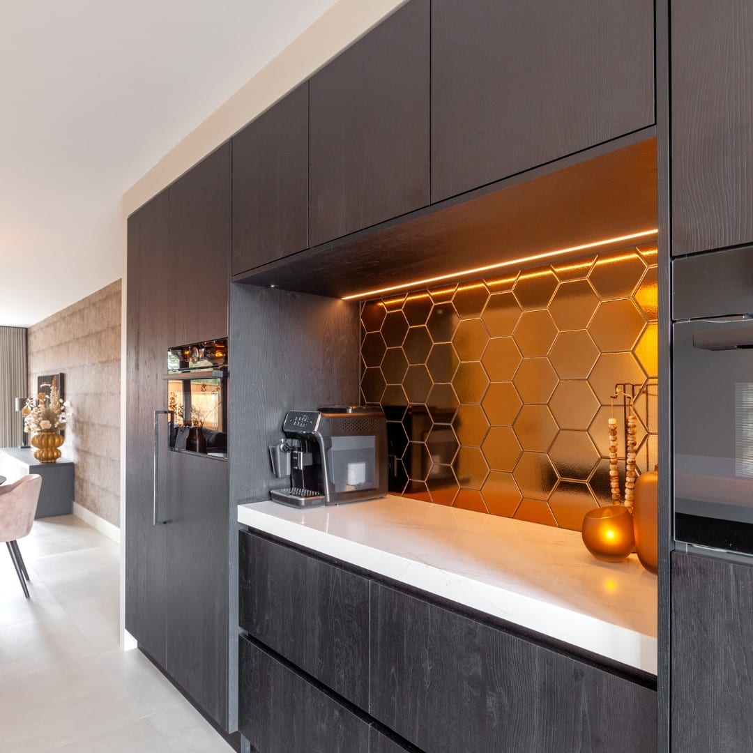 De hexagon tegels passen perfect bij de lichte kleuren van het marmerlook keukenblad en de donkere kleuren van de houten keuken. Maar bovenal geeft het de zwarte design keuken een eigenzinnig karakter.