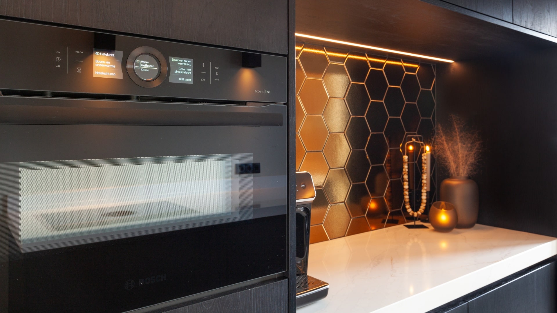 • Achterwand: Speelse gouden hexagon tegels voor een eigenzinnig karakter
