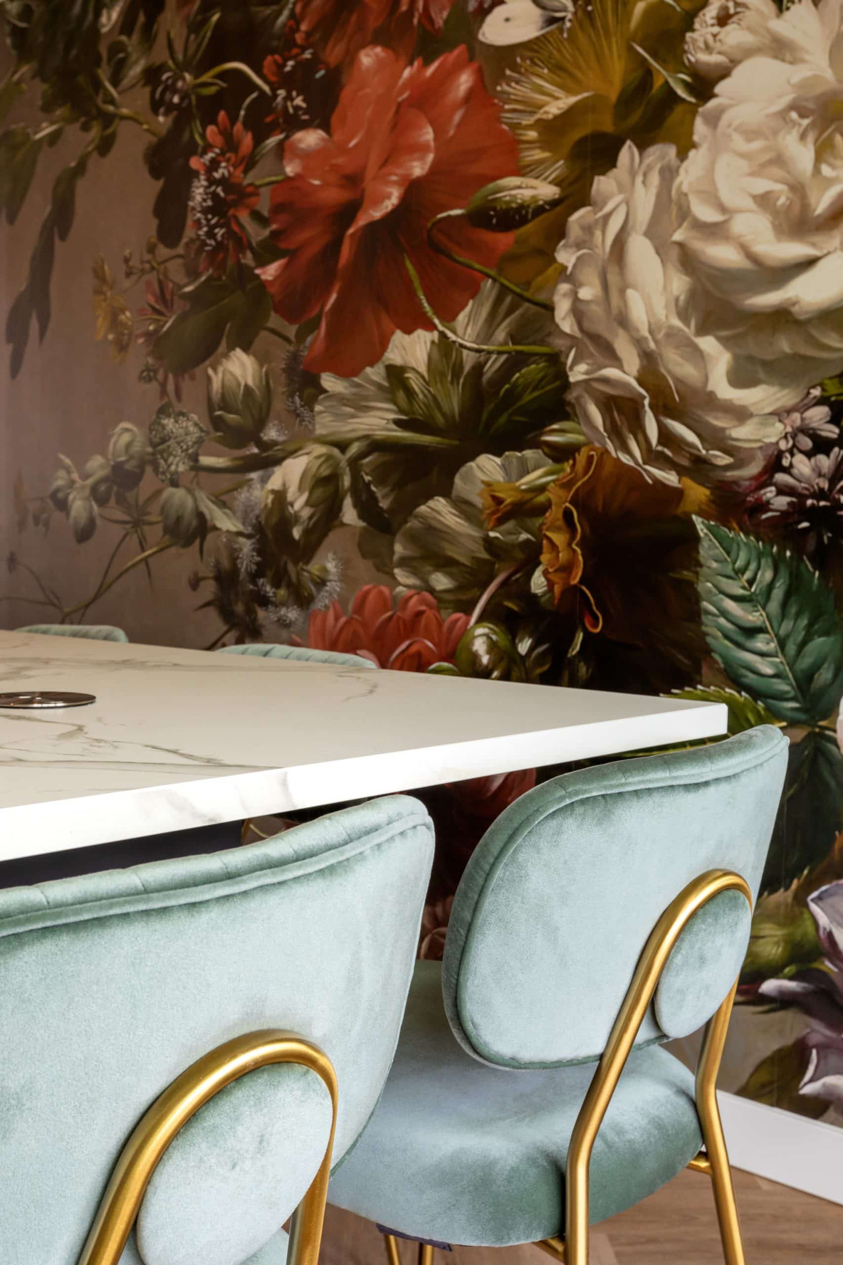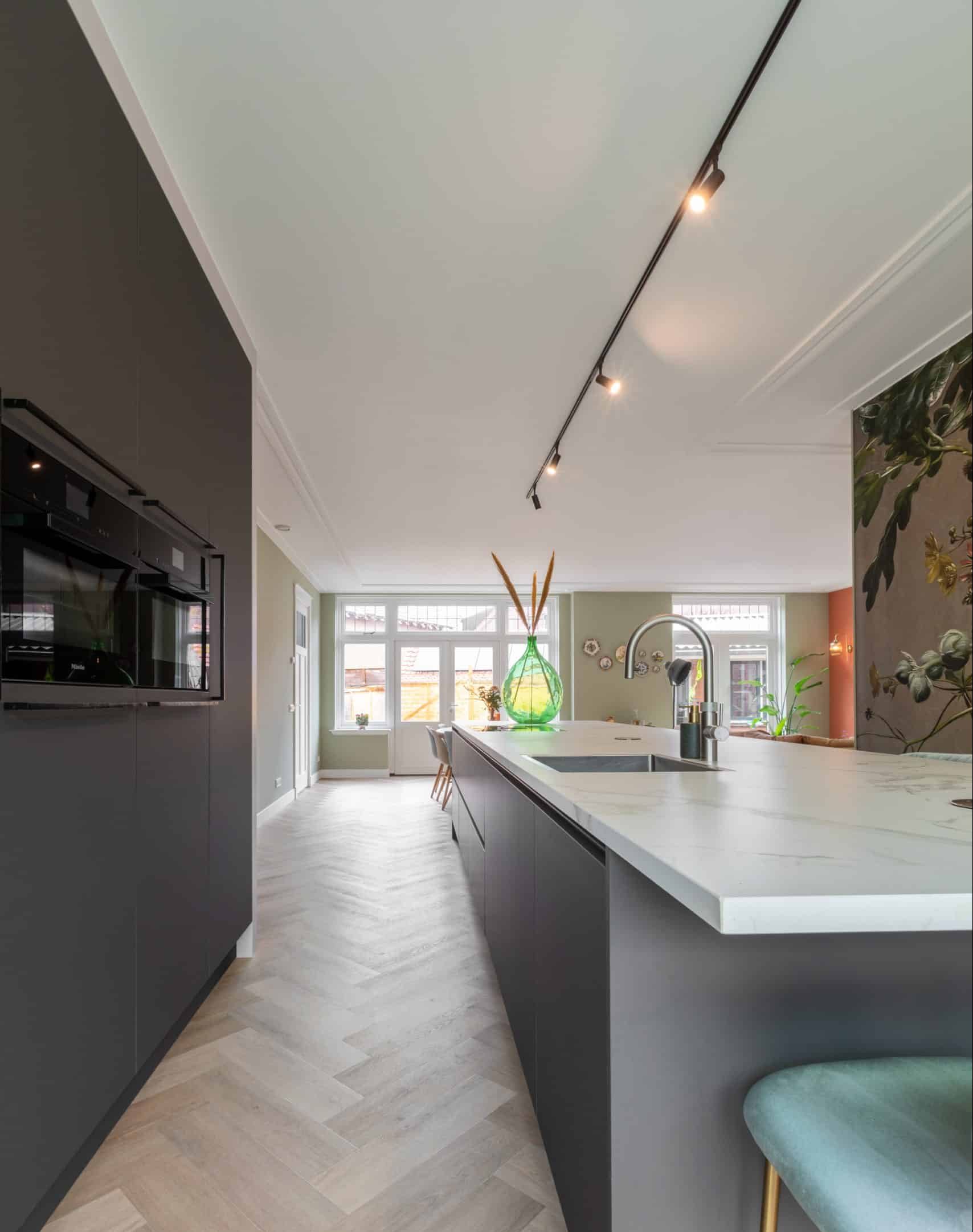 Het werkblad in de keuken is gemaakt van dekton. Dit is een zeer sterk en onderhoudsvriendelijk materiaal. Het aanrechtblad is voorzien van een prachtige marmerlook. Omdat het werkblad van de keuken heel groot is, is gekozen om de structuur van het marmer door te laten lopen in de volgende plaat.