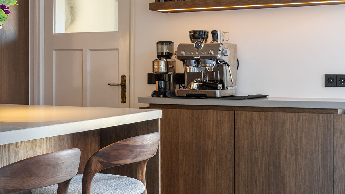 De kracht van deze keuken zit in de balans tussen het karaktervolle notenhout en het rustige werkblad. Deze combinatie leent zich uitstekend voor een minimalistische setting, maar komt net zo goed tot zijn recht in een klassiek interieur. Het lichte blad vormt een kalm tegenwicht voor de diepe, warme kleur van het walnoothout. Of de keuze nu valt op een volledig houten opstelling of subtiele details: de mix van texturen voegt altijd karakter toe zonder de rust in huis te verstoren.